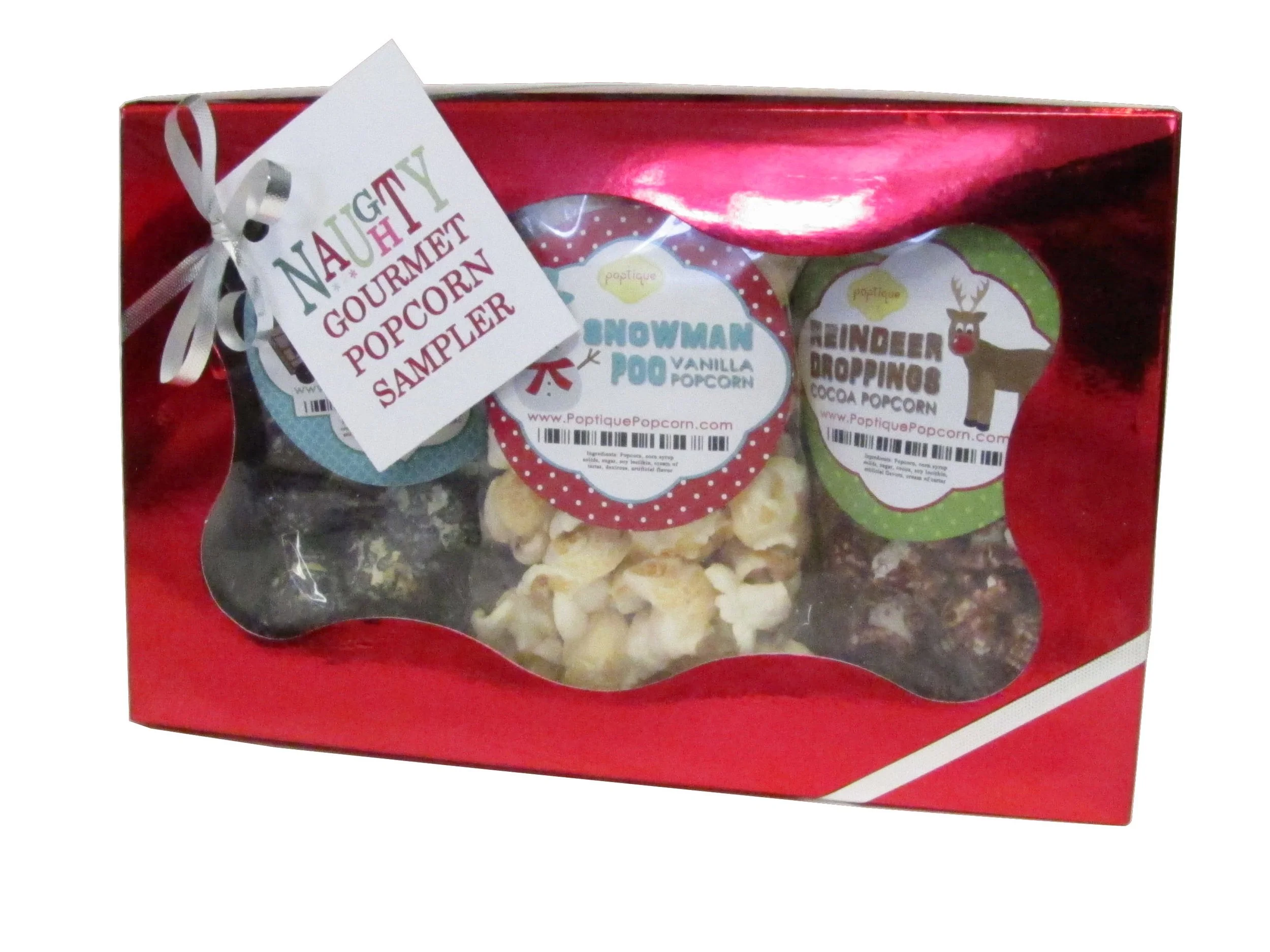 Make your Christmas gifting POP! A perfect “gag gift” idea for the “naughty” friends and family in your life. Send it packaged with delicious holiday flavors including three (1-cup) bags of popcorn: one Lump o’ Coal (Black Cherry), one Reindeer Droppings (Cocoa), and one bag of Snowman poo (Vanilla). Presented in a red decorative box, crinkle filling, and wrapped with either a silver or gold elastic bow.